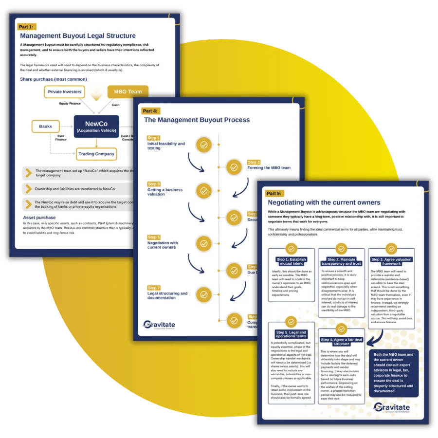 Like all transaction types, there are pros and cons to a Management Buyout. The guide will summarise these in balanced terms.