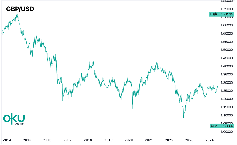 Here’s a chart of the pound vs the US dollar for the past ten years, to demonstrate this: